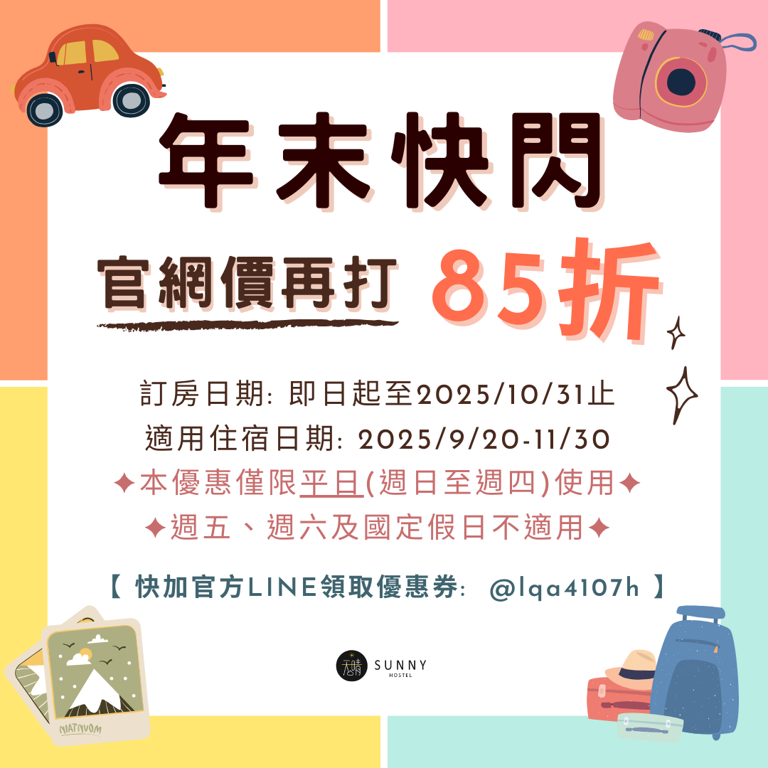 即日起至2025/10/31,直接在官網線上訂房或來電預訂2025/11/30前的住宿,並領取官方LINE好友優惠券,即可享